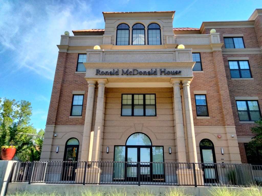 Dålig bild, men mäktigt entré till RMHC Intermountain Area . Det finns Ronald McDonald-hus i Sverige också. De fungerar annorlunda, men har och fyller samma syfte – ”a home away from home”. I vårt fall far away from home. *