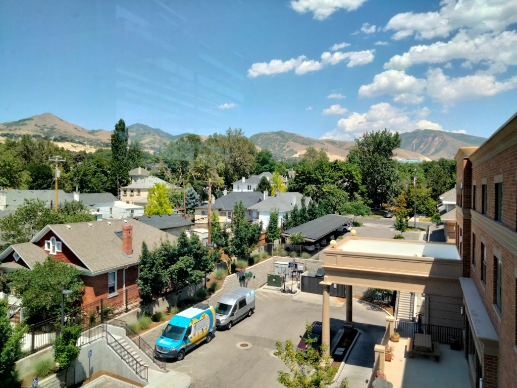 Igår var lillebror och jag nere i stan. Vi tog en Uber till Temple Square där bland annat Tabernaklet finns. Jag antar att det vid sidan av bergsvyn, som ramar in dalen som utgör Salt Lake City, är den mest berömda sevärdheten. Lillebror var mer imponerad av ett par av höghusen bredvid. Det var också han som skötte kameran, han valde att fotografera höghusen och ventilationsanläggningen framför kyrkan istället för själva tabernaklet – en förmildrande omständighet var att det pågår omfattande renovering av kyrkan. Vi hann gå på HM också. Jag hoppas att vi får möjlighet att åka upp i bergen, det verkar vara storslagen natur. Park City ska vara fint också.