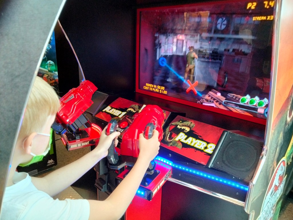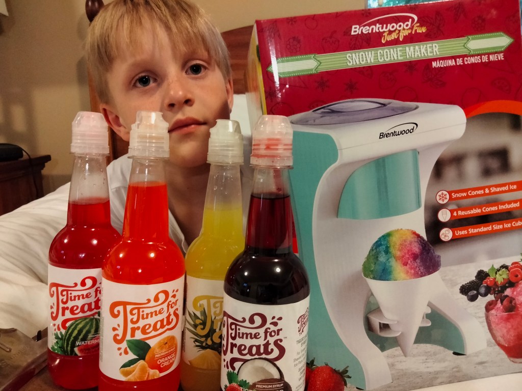 Yesterday I rode the Ferris wheel indoors and bought a slingshot. I also ate a mega ice cream and played in a slot machine (shot dinosaurs). Then we went and bought a snow cone maker and different flavors for it. We had to go to three different stores before we found everything.