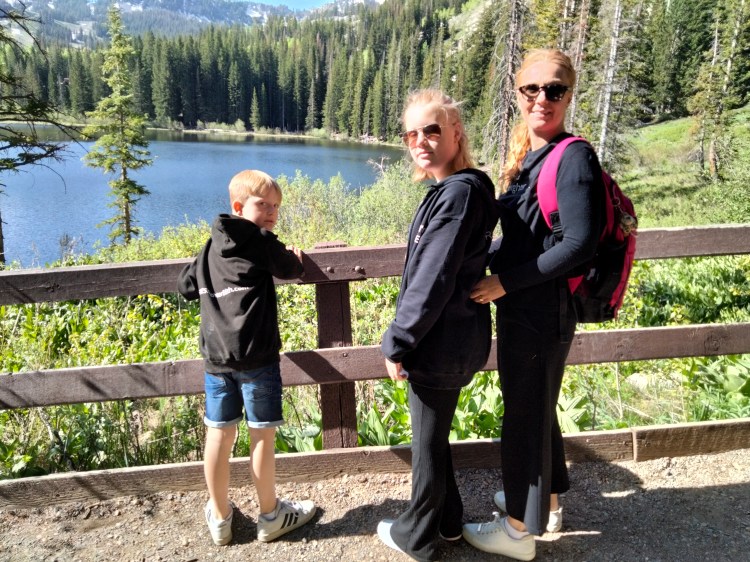 This time we also saw more of SLC, of the city and its suburbs, but also of the nature around. It is special to ride from the city’s heat up into the cooler mountains, to see the snow that is still on the peaks when it is 100 degrees 20 minutes away. The mountains are beautiful and you understand why Utah residents are proud of their nature and like to camp or ”glamp” and hike in the mountains. It was extra fun that Edith was quite alert both at dinner and the shopping trip with Kitty and at the mountain trip with the Lee family. She managed to walk around the small mountain lake and was happy to meet Mia and her family.
